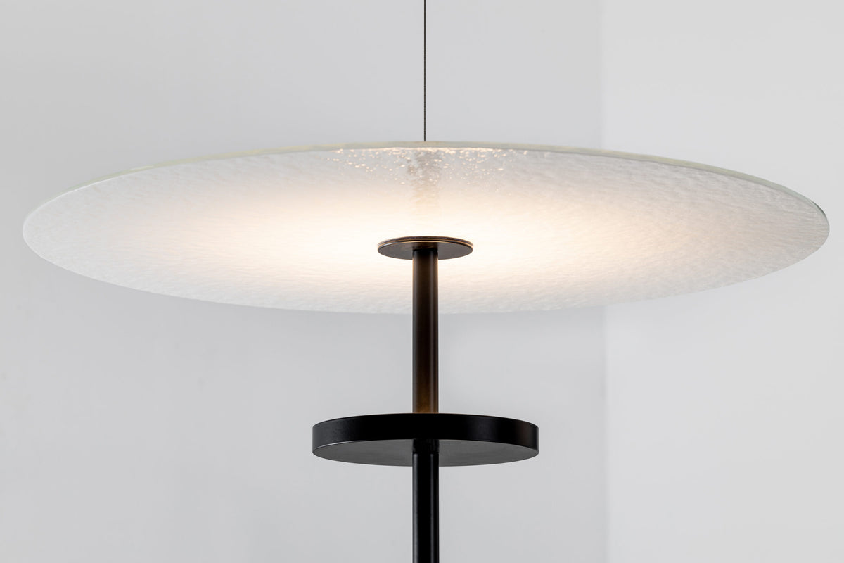 The Trezero Single Pendant Lamp is a refined variation of the Trezero Pendant Lamp by Hind Rabii Lighting Studio. This single-disc version retains the elegance and craftsmanship of its triple counterpart but is designed for more intimate or minimalist settings. Crafted with hammered Murano glass and a beautiful galvanic finish, it creates a delicate interplay of light and shadow, adding a touch of sophistication to any space. Available in different sizes (S, M, L), the Trezero Single Pendant Lamp is perfect for smaller spaces or as part of a series for a cohesive lighting arrangement. It’s a versatile choice for homes, offices, or commercial interiors.