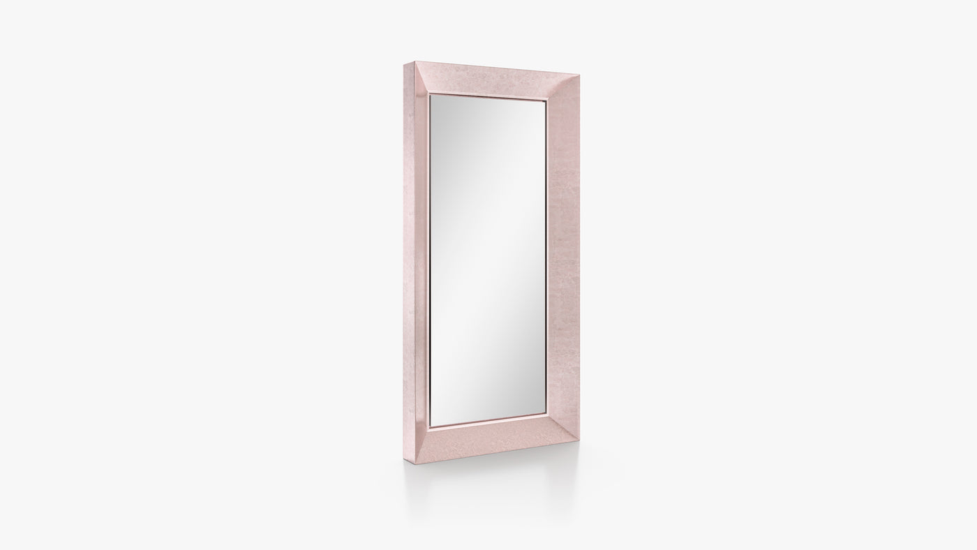 The Narciso Mirror, designed by Silvano Pierdonà,is a dramatic statement piece that draws inspiration from the Greek myth of Narcissus. Unlike standard mirrors that sit flat against a wall, the Narciso Mirror is a sculptural "box" mirror designed to create a sense of immersion and deep perspective. It acts as a portal, inviting the viewer to step into its majestic, architectural frame. The hallmark of the Narciso is its massive, inwardly converging frame. This "funnel" effect creates a forced perspective that makes the mirror feel like a window into another room, adding significant architectural depth to any wall. True to its mythical namesake, the Narciso is designed for impact. It is typically available in large, floor-to-ceiling or wide rectangular formats that dominate a space with their structural presence. The frame is constructed from precision-folded sheet metal, allowing for sharp, clean lines that highlight Capod’opera's mastery of metalwork and geometric discipline. The mirror glass is meticulously bonded to a rear panel, ensuring a seamless look where the focus remains entirely on the reflection and the surrounding textured frame.
