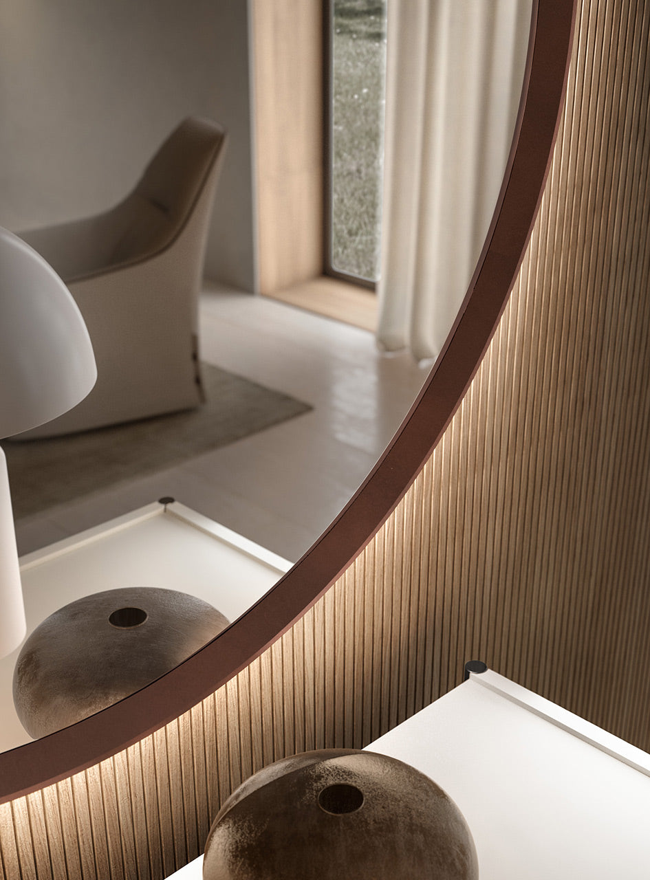 The Peep Mirror, designed by Silvano Pierdonà, is a contemporary masterpiece that blurs the line between a functional mirror and an ambient lighting fixture. Conceptually designed to resemble a "wall light point," the Peep mirror uses clever tapering and hidden technology to create a soft, ethereal glow that makes the unit appear to float off the wall. The hallmark of the Peep mirror is its rounded wooden frame. The profile of the frame is not uniform; it undergoes a slight "tapering" toward the wall. This anatomical detail is what allows it to house technology without compromising its slim, elegant aesthetic. The tapering creates a discreet pocket along the perimeter where LED strips can be fitted. Because they are tucked away from direct view, the light doesn't shine in your eyes; instead, it washes back toward the wall, creating a "halo" or "backlit" effect that emphasizes the mirror's silhouette. Due to the way the light spreads onto the wall behind it, the Peep mirror loses its visual "weight," appearing as if it is levitating. This makes it an excellent choice for adding depth to smaller rooms or dimly lit hallways. Available in multiple circular diameters, the Peep relies on the perfection of the ring to bring harmony to a space. It works beautifully as a single focal point or as a cluster of varying sizes.