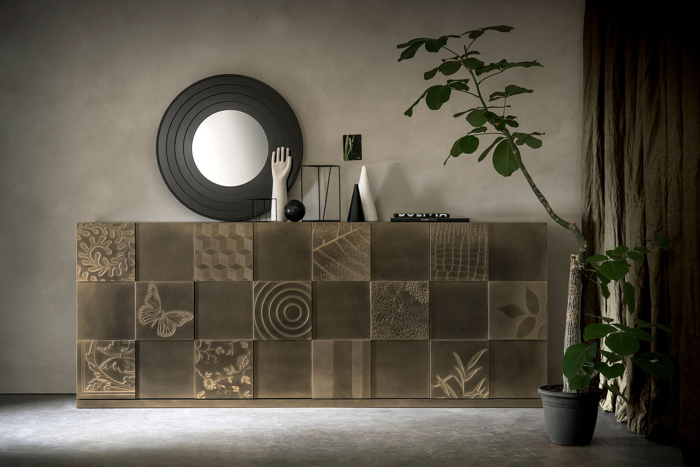 The Quadro sideboard, designed by Alessio Bassan for Capod’opera, is an iconic piece that bridges the gap between furniture and rationalist architecture. It is best known for its "checkerboard" facade, which creates a rhythmic, sculptural effect that changes depending on how the light hits it. The "Quadro" sideboard (meaning square or painting) gets its name from the uniform 30x30 cm panels that make up its front. These panels are applied at two different depths (18 mm and 30 mm), creating a dynamic 3D surface of "projections and recesses."The alternating depths of the squares give the piece a sense of movement. This "optical art" effect can be subtle in monochromatic lacquers or bold when mixing different colors or textures. The top and sides are joined at a perfect 45-degree angle with concealed joints, giving the sideboard a solid, monolithic appearance. To maintain the clean geometric lines, there are no visible handles. A 10x10 mm gap (milling) between the top/sides and the doors serves as a continuous "shutter" for opening.