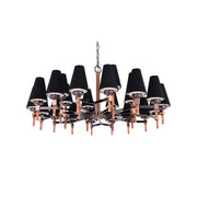 DEW D16/17 is a 24/12 lights chandelier, 24 x E14 max 28W not supplied. Gunmetal finish and polished nickel details, black leather tape, polished nickel lampshades.