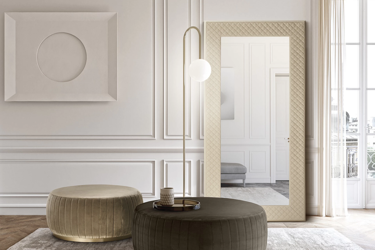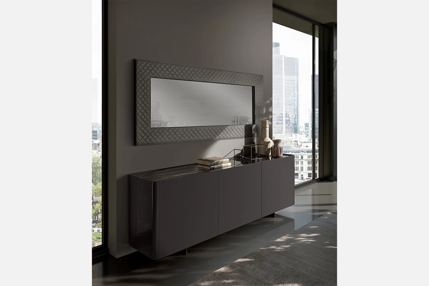 The Prisma Mirror by Eforma is a high-impact design piece that bridges the gap between contemporary minimalism and classical luxury. Characterized by its opulent, upholstered border, the Prisma is as much a piece of soft wall art as it is a functional mirror. It is designed to bring warmth and texture to the often cold surfaces of modern architecture. Created by Antoy Filips, the Prisma mirror centers on the concept of a "soft frame." While most luxury mirrors use metal or wood, the Prisma utilizes quilted upholstery to create a sophisticated, tailored look reminiscent of high-end Italian fashion and leatherwork. The contrast between the rigid, dark smoked glass and the plush, textured frame creates a compelling sensory experience. The frame is defined by meticulous stitching, available in a smooth or diamond-quilted pattern that adds depth and an artisanal "couture" feel. The mirror features high-quality smoked glass as standard, which softens reflections and adds a moody, atmospheric quality to the room.Depending on the size chosen, the Prisma can be a towering vertical statement or a broad horizontal centerpiece above a sideboard like the Alma. The Prisma Mirror is available in several square and rectangular formats to suit different wall scales The Prisma mirror is the ideal choice for those who want to introduce texture and softness into their decor. It pairs beautifully with other upholstered elements in a room, such as a leather sofa or a fabric-wrapped bed, creating a cohesive, "total look" interior. It is particularly effective in master bedrooms and formal dining areas where it acts as a soft, luminous focal point.