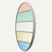 The Vitrail Mirror, designed by Inga Sempé for Magis, is a modern mosaic that reinterprets classic Venetian glasswork. Moving away from traditional single-pane reflections, Vitrail uses tinted glass segments to create a "window-like" decorative piece that frames light and color as much as it reflects the viewer. Inspired by antique mirrors framed with smaller glass fragments, Sempé developed a collection that combines clear and colored glass strips. These elements are held together by a soft rubber frame, creating a clean, industrial contrast to the delicate glass surface. The collection features eight versions across four distinct geometric shapes, each with a slim 1.6 cm depth: Depending on the frame color (Light Grey or Green), the Vitrail mirror segments feature varying tones like gold, emerald, pink, and blue. All shapes can be hung vertically or horizontally. The round version is unique for its ability to be mounted diagonally. Due to their graphic nature, these mirrors are ideal for grouping together to amplify light and add architectural interest to hallways or living spaces. The Magis Vitrail Mirror is a playful, sophisticated choice for those looking to move beyond standard silver mirrors into the world of functional wall art.