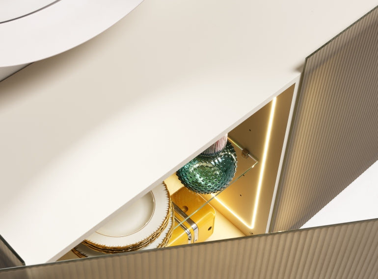 The Groove Sideboard by Minottiitalia is a masterclass in texture and transparency. Designed to challenge the conventional "solid" look of storage furniture, this piece uses rhythmic, vertical lines and industrial-chic materials to create a light, ethereal presence in contemporary living or dining spaces. The defining feature of the Groove Sideboard is its use of ribbed tempered glass. Unlike traditional wooden cabinets, the Groove allows for a subtle "peek-through" effect that obscures clutter while playing with ambient light. The doors and sides are crafted from sandblasted, ribbed tempered glass with a transparent bronze finish. This creates a beautiful play of shadows and highlights (the "grooves") across the surface. The structure is supported by a sturdy MDF frame, finished in an embossed lacquer that provides a matte, sophisticated contrast to the reflective glass. Set on slender black feet, the sideboard appears to float, making it an ideal choice for maintaining an "open" feel in smaller rooms.