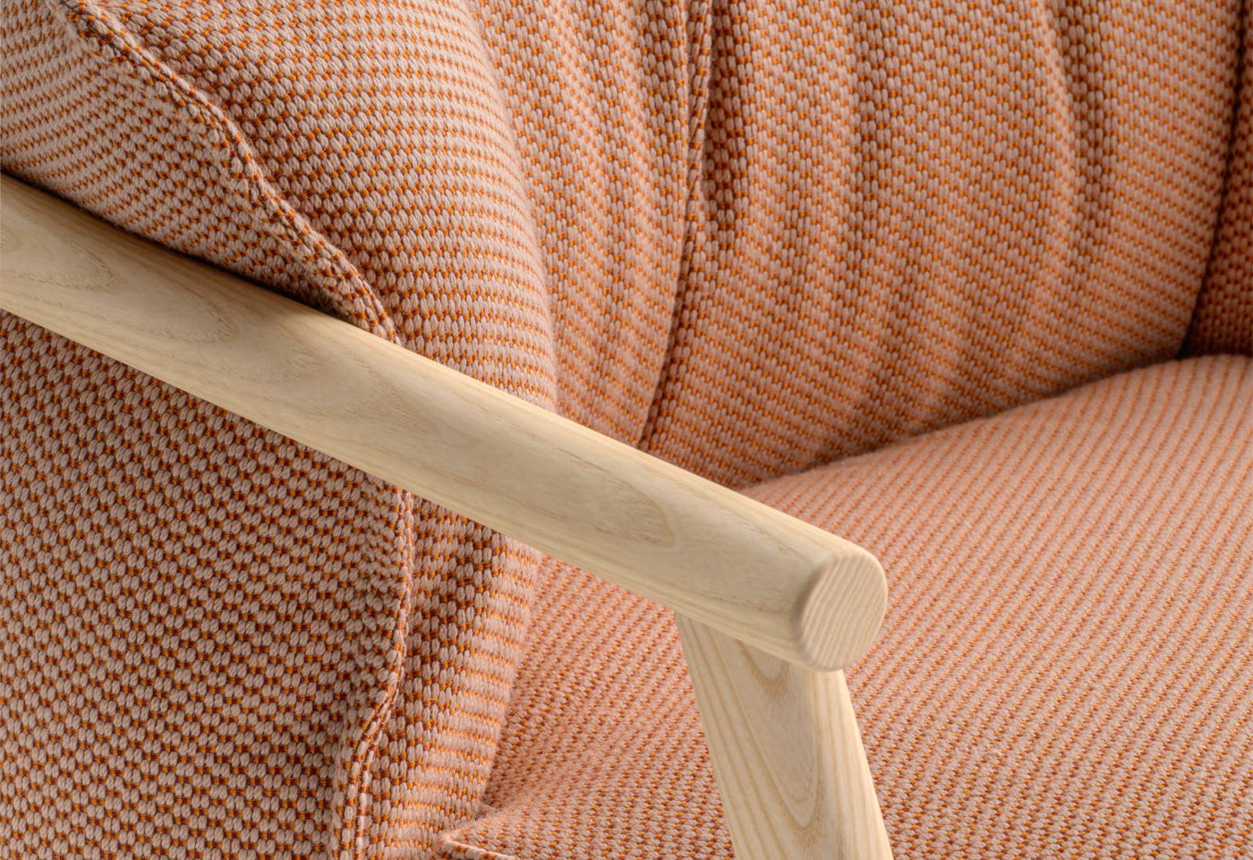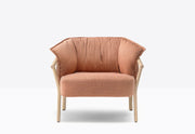 Lamorisse Wood 3689 Lounge Chair designed by CMP Design for Pedrali, translates the relaxed elegance of the Lamorisse collection into a sophisticated and practical lounge chair for indoor use. Perfect for luxurious dining rooms, fine restaurants, or high-end contract environments, it achieves a beautiful balance between the warmth of wood and the softness of its generous upholstery.The frame is constructed from solid ash wood, with oval-section legs that seamlessly blend into steam-curved, round-section armrests. The wood structure is designed to increase slightly in thickness near the joints for enhanced strength and solidity. The lounge chair features a soft, generous, and embracing cushion that creates a striking visual contrast with the slender wooden frame, evoking a sense of lightness and inviting comfort. The upholstered seat is supported by a thin metal frame with elastic belts and non-deformable, fireproof polyurethane foam, ensuring a high level of comfort built to last. The soft, wrap-around backrest cushion is joined to the seat by a zip for a neat, cohesive look and features a distinguishing hard leather strap that secures it to the ash frame. The lounge chair is conveniently stackable up to 2 pieces, offering a space-saving solution for commercial and hospitality settings. The cushion covers are completely removable for easy maintenance and cleaning. The Lamorisse Wood 3689 lounge chair seamlessly combines Italian design excellence, plush comfort, and essential contract functionality, making it a sophisticated and versatile choice for any interior space.