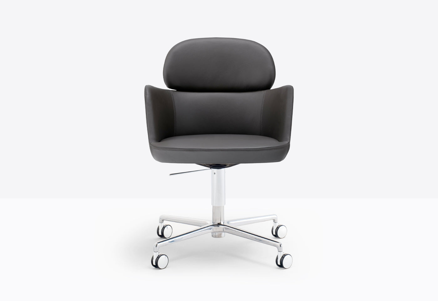The Ester 695 Swivel Office Chair by Pedrali extends the collection's signature luxury and comfort into the professional workspace. Designed by Patrick Jouin, this executive chair is a perfect synthesis of elegance, ergonomics, and functionality. It features the same soft, sinuous lines and plush upholstery as the rest of the Ester series, ensuring an inviting and comfortable seating experience. The chair is mounted on a die-cast aluminum four-star base with a swivel mechanism and castors, providing effortless mobility. A gas lift allows for height adjustment, making it a highly practical and versatile choice for executive offices, conference rooms, and high-end home offices. The Ester 695 Swivel Office Chair transforms the traditional office chair into a statement piece of sophisticated design.