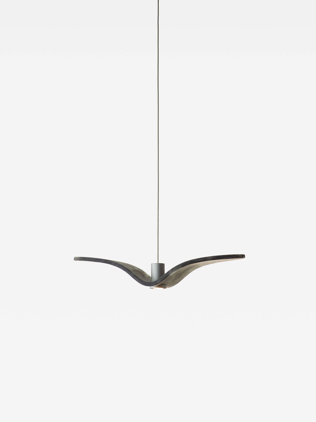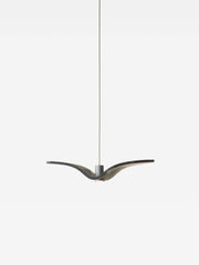 The Night Birds Mini Pendant Lamp by Brokis is a captivating and poetic lighting fixture designed by Boris Klimek.Inspired by the graceful freedom of birds in flight, this pendant light brings a touch of nature's dynamism and enchantment to any interior space.The design captures the essence of birds taking flight, with a stylized silhouette of a bird's wings. This evokes a sense of lightness, movement, and natural beauty. The shade is meticulously crafted from hand-blown glass, a hallmark of Brokis' exceptional craftsmanship. This ensures a unique character for each piece, with subtle variations in texture and form. The glass is available in various elegant finishes, including transparent, smoke grey, and potentially others like opal or dark variants, allowing for different aesthetic expressions and light diffusion qualities.The lamp also features refined metal components, often with anodized finishes in colors like black or silver, providing a sophisticated contrast to the glass. The Night Birds Mini Pendant Lamp provides a warm and inviting glow.The hand-blown glass diffuses the light beautifully, creating a gentle ambiance and highlighting the sculptural form of the "bird."