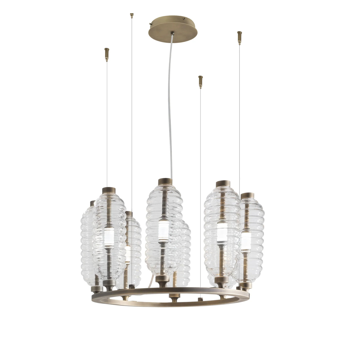 Inspired by the traditional Murano "rigadin" technique, the Trinity 09 Suspension Lamp by Mike Shilov blends refined craftsmanship with modern elegance.This chandelier features eight integrated LED lights within clear, blown glass shades, each with a distinct horizontal striped relief. It provides warm white 3000°K illumination with a Wi-Fi enabled dimming function, allowing for a fully customizable ambiance. Optimized for smaller spaces, the lamp makes a significant visual impact without being overwhelming, making it suitable for both private homes and public environments. The Trinity 09 Suspension Lamp is also available in satin nickel and burnished brass finishes. All bulbs are included. Trinity is an ideal option for those who seek lighting that is both functional and decorative. Each element is designed to add a touch of sophistication to spaces, transforming light into a visual and sensory experience.