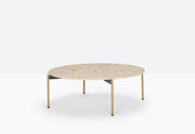 The Blume BLT_89 Round Coffee Table, designed by Sebastian Herkner for Pedrali, is an elegant complement to the seating collection, perfectly translating its luxurious and sophisticated aesthetic into an exquisite table design. The BLT round table is characterized by the distinctive visual language of the Blume family, where meticulous detail is celebrated as a fundamental design element. The table’s structure proudly features the collection's iconic sophisticated flower-shaped profile in the extruded aluminum frame. This signature detail is showcased most dramatically where the frame meets the tabletop, gently protruding beyond the top's perimeter to highlight its precious, sculpted form. Designed to suit the most discerning interiors, the BLT is offered with high-end tabletop finishes, including exquisite natural Marble (such as Rosso Levanto or Fior di Pesco), Composite Marble, and high-performance Solid Laminate or Fenix. This variety allows for unparalleled customization to match any luxurious décor scheme. The BLT is available in a range of sizes and heights, encouraging the creation of dynamic, layered compositions. This adaptability makes it ideal for use as a central coffee table, a sleek side table, or nested in groups in sophisticated lounges, reception areas, and private residences. The aluminum frame is available in multiple elegant finishes, including metallic tones like Antique Brass and Bronze, which further enhance the table's luxurious feel and visual warmth. The Blume BLT_89 Round Coffee Table is a sculptural, refined piece that combines the industrial strength of metal with the timeless beauty of premium surfaces, making it an essential accessory for a contemporary and sophisticated living space.