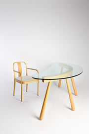 The Boomerang Desk by Wiener GTV Design, originally conceived in 2001 by Enzo Mari for Gebrüder Thonet Vienna (now Wiener GTV Design) and re-edited for Salone del Mobile 2025, embodies a blend of playful design and functional simplicity. Its defining feature, a curved laminated beech wood beam directly inspired by boomerang-shaped architectural elements, gives the desk its distinctive name and character. The extra-clear tempered glass desk top follows the gentle curve of the base, creating a dynamic yet graceful aesthetic. This transparency lends the desk an approachable and light feel. Supporting the structure are four sturdy yet slender legs made of solid beech wood. The design reflects Enzo Mari's signature approach of favoring pure forms and rational construction, where the function of each element is easily understood. Described as a friendly and warm piece, the Boomerang Desk is suitable for both office and home environments, offering a gentle embrace to its user. Its democratic quality, stemming from the transparent surface, makes the occupant feel approachable rather than imposing. The Boomerang Desk is a statement piece that combines a classic design sensibility with a touch of whimsical inspiration, making it a unique and eye-catching addition to any workspace.
