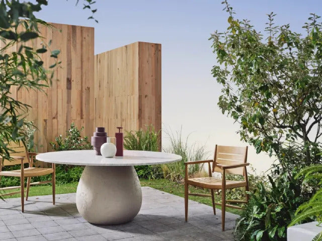 The Inout 834 836 Round Dining Table with Carrara marble top. Full volumes and rounded shapes define the Inout 834 836 Round Dining Table family: available in two sizes. They have a sculptural base with a rounded shape made of GFRC concrete, finished with a matt grey paint. It supports a thin round top in white Carrara marble. Even the weaving tradition is re-interpreted to resist water and sunlight, maintaining its technical characteristics and colors unaltered over time. This table is ideal for your patio.