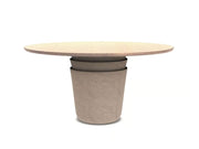 The Kasane 38/39 Round Dining Table is distinguished by its material surface and the unique design of the base. It is designed for use in gardens and outdoor areas, but it is also perfect for the living area of a home. The name "Kasane" means "overlap" and refers to the connections that characterize the design. The central base resembles a series of stacked cylinders, inspired by cups that gradually become taller when stacked on top of each other. The round top is made of MDF, while the base is made of expanded polymer. A thin layer of sand and clay is hand-applied to the surfaces, creating a raw, irregular, and rough texture that provides a tactile experience. The Kasane 38/39 Round Dining Table for or added durability, this layer is combined with a matte protector.