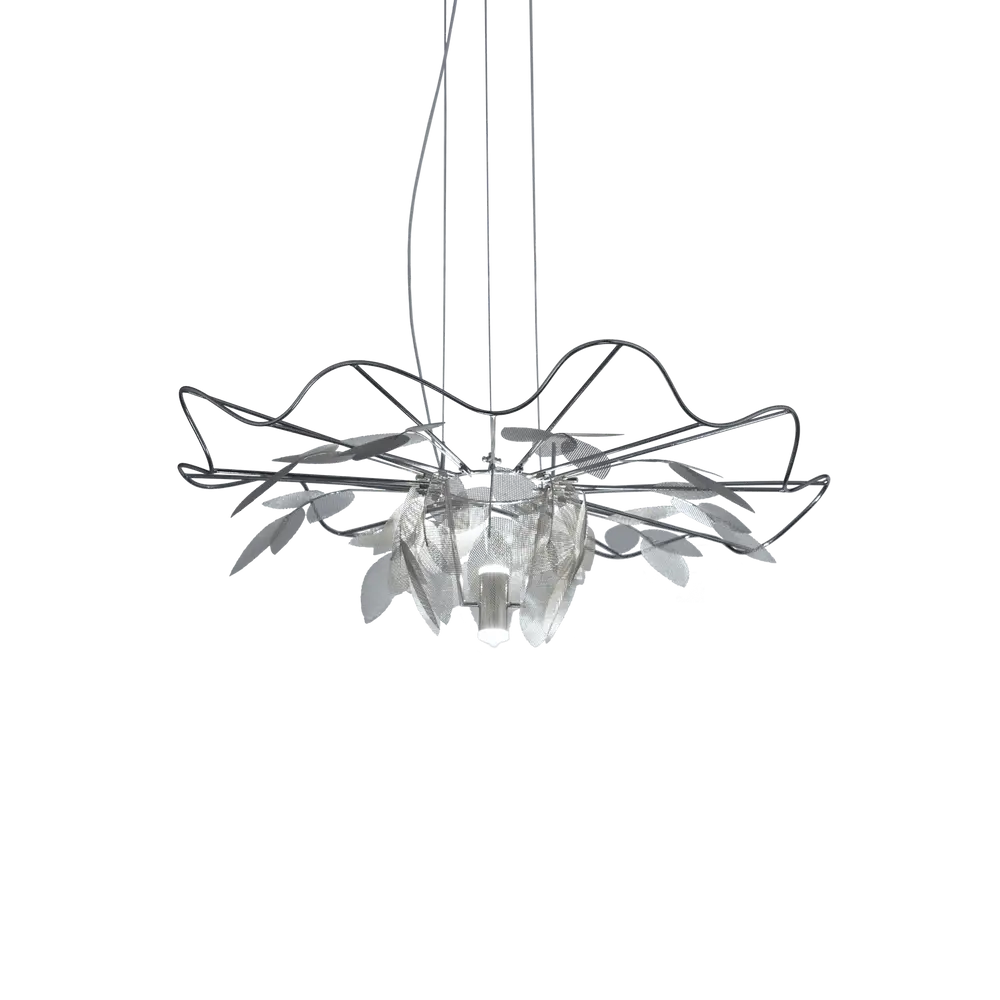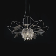 The Jardin Impossible 01 Suspension Lamp by Patrizia Garganti is a tribute to the beauty and complexity of nature. This unique piece is a handcrafted "garden" of delicate, perforated steel leaves and flowers made from metal wire and crystal pearls. Each element is meticulously shaped by hand, creating a truly artistic and sculptural form. The name of the collection, "Jardin Impossible," perfectly encapsulates its concept: a fantastical and impossible garden brought to life through light and exquisite materials.This Jardin Impossible 01 Suspension Lamp transforms light into a poetic experience, adding a touch of whimsy, elegance, and natural grace to any space. It is a true example of Patrizia Garganti's commitment to creating one-of-a-kind, luxury lighting that marries artisanal craftsmanship with creative design.