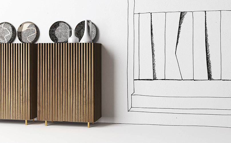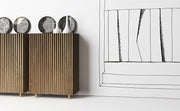 The Dorotea High Sideboard designed by Claudio Lovadina, is a striking example of optical artistry in furniture design. Part of Minottiitalia’s prestigious collection, this piece focuses on the interplay between geometry and organic materials, creating a visual illusion that changes as you move around it. The hallmark of the Dorotea High Sideboard is its "optical graphic effect." The Dorotea High Sideboard features a unique surface treatment where the doors and sides are crafted from black agglomerate wood, precisely cut into triangular sections. These sections are then overlaid with Teak wood in a fluted motif that tapers downwards. The result is a stunning three-dimensional relief that creates shifting shadows and a sense of vertical movement, making the unit appear slimmer and more dynamic. The internal structure features a sleek, black embossed finish, emphasizing the brand's attention to detail inside and out. Customize the silhouette with a minimalist black plinth or elegant metal feet in satin brass or nickel.