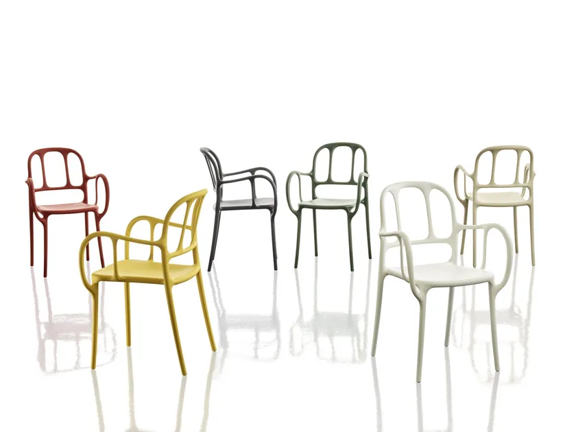 The Milà Stackable Dining Chair is an elegant chair with armrests designed by Jaime Hayón and manufactured by Magis using the gas-assisted injection molding technique. Its elastic and lively shape is reminiscent of Catalan modernism and stands out with its silk-effect finishes. This original chair has a versatile and functional design, as it can be stacked, used in outdoor environments, and is available in a wide range of colors. The Milà Stackable Dining Chair is a practical, sturdy, and elegant solution for furnishing both residential and commercial spaces.