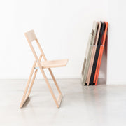 The Aviva Folding Chair by Magis, designed by Marc Berthier is a classic example of functional and elegant Italian design. This chair is renowned for its simplicity, lightness, and ingenious folding mechanism, making it a versatile and space-saving seating solution. Crafted entirely from solid natural beechwood, the Aviva Folding chair showcases the beauty and warmth of the material. Its design is intentionally minimal, focusing on the essential elements of a chair while ensuring comfort and durability. The chair features a smoothly curved backrest that provides good lumbar support and a comfortable seat.The brilliance of the Aviva Foldin chair lies in its effortless folding mechanism. With a simple movement, the chair can be folded flat, making it incredibly easy to store when not in use. This feature makes it ideal for small spaces, extra seating for guests, or for use in areas where furniture needs to be easily moved and stowed away, such as balconies, terraces, or multi-purpose rooms.