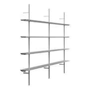 The Hypostila Shelving is a versatile piece of furniture, made from extruded aluminum profiles that are connected using expansion pieces. This design allows for the shelves to be positioned anywhere without the need for holes. Bd has a particular interest in shelving, as it helps to organize spaces. The Hypóstila Shelving was created in 1979 by Lluís Clotet and Óscar Tusquets, and is made up of simple vertical uprights that are attached to the wall. These uprights are made from matte anodized aluminum and come in heights of 2, 3 or 4 meters. The shelves can be customized to fit any space and can even have rounded corners. White galvanized iron hardware is used to attach the profiles to the wall, while the feet are made from matte anodized cast aluminum. The shelves from Hypóstila II can be combined with those from Hypóstila I.