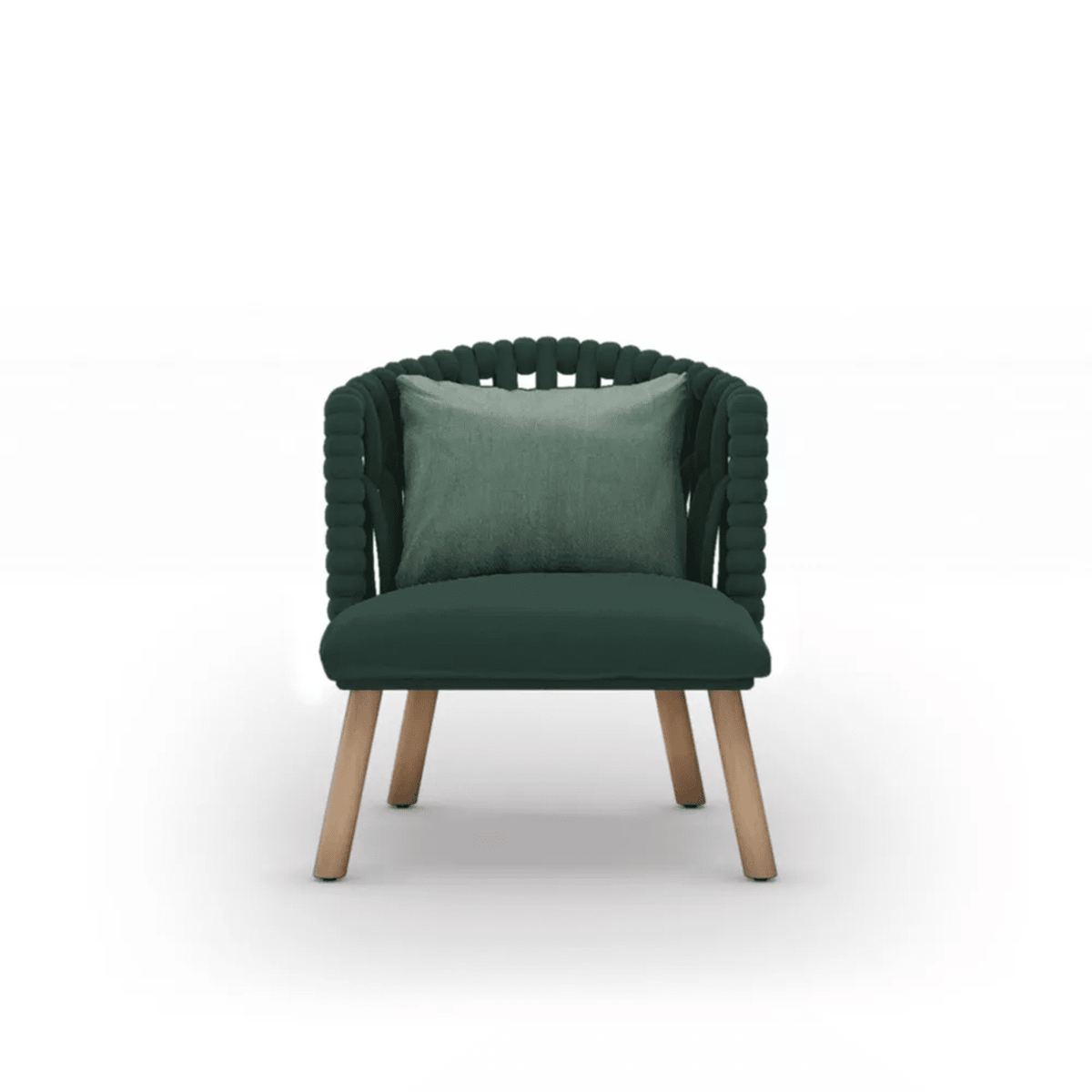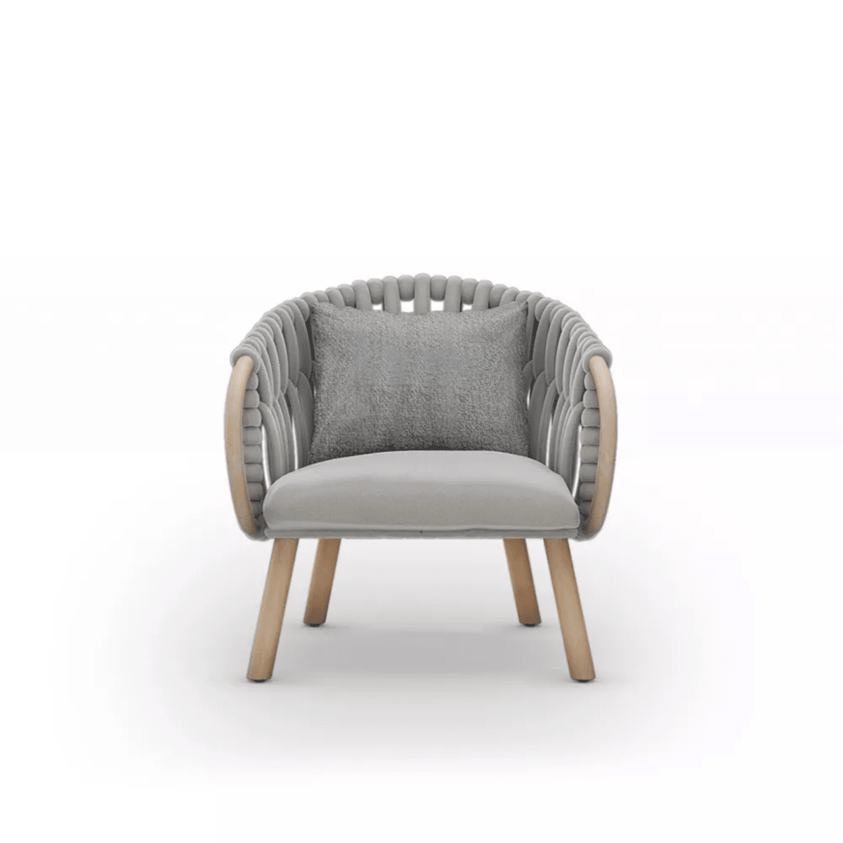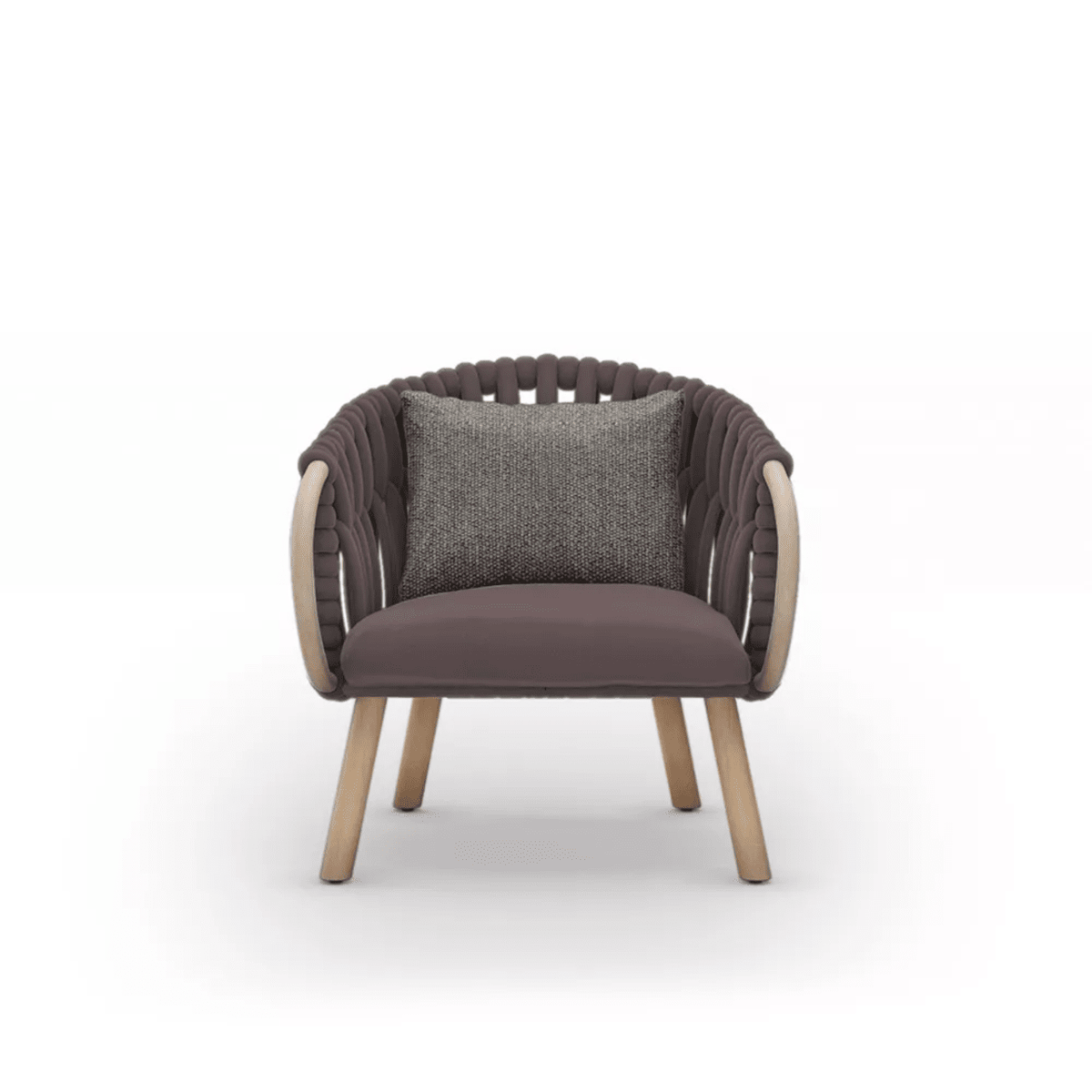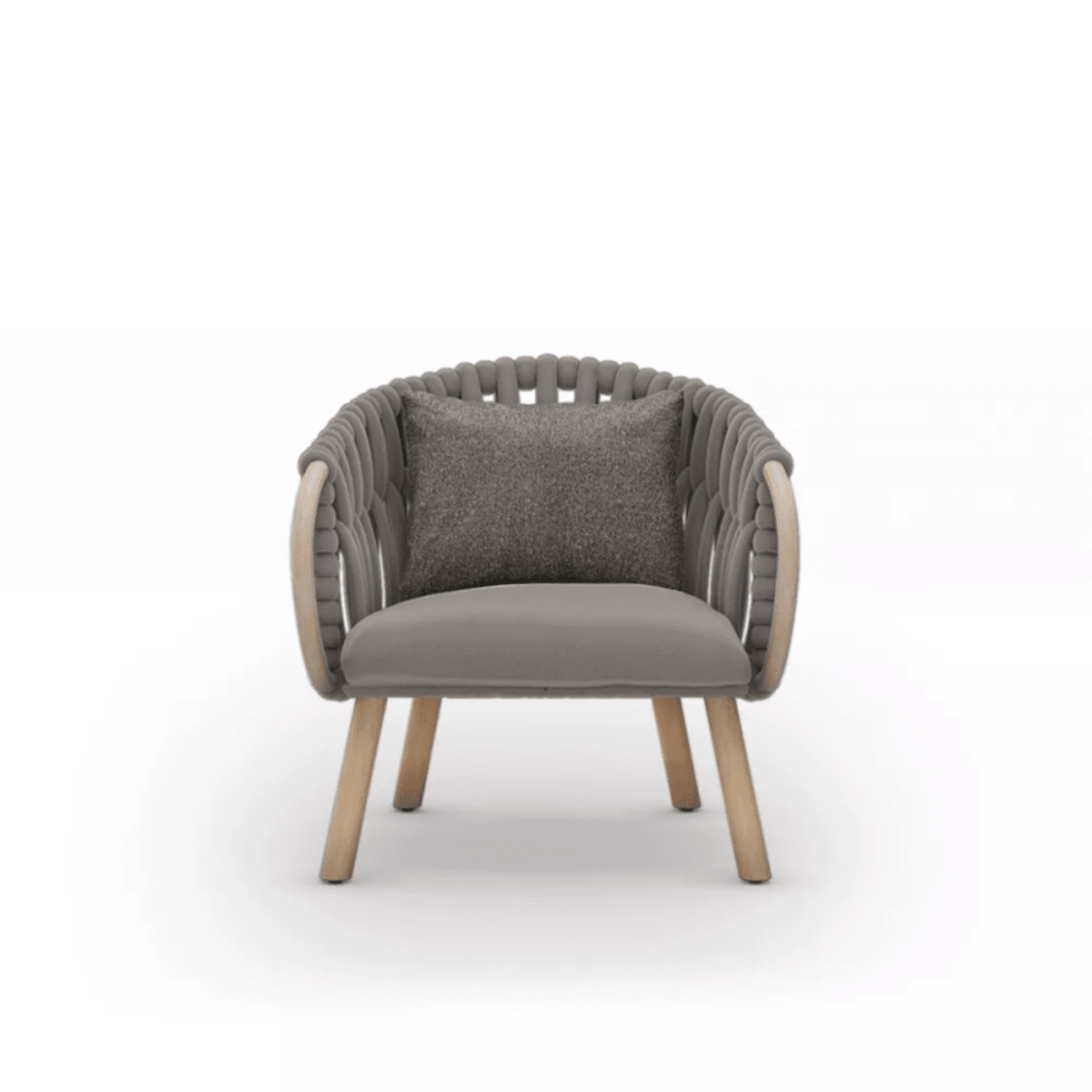 The Knit collection ignites our neverending love for Nordic woodcrafi and needlework. Soft and plush fabric tubes are woven over a metal frame and capped with finely crafted wooden legs.We added a tropical touch by adding bent rattan arms to this woven classic.