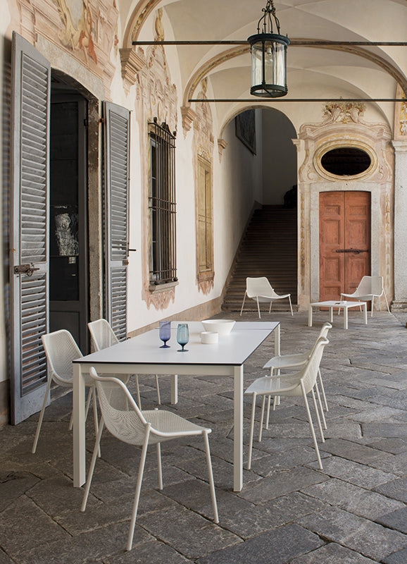 The Round Extendable Rectangular Dining Table with HPL Top was designed to strike a perfect balance between structured and soft lines. Round Extendible Rectangular Dining Table with HPL Top is designed to add an elegant and uncluttered touch to outdoor spaces with its furniture pieces featuring light and airy shapes. The elements of the collection boast clean and simple shapes, making them suitable for both residential and commercial settings. This table is designed to provide flexible dining space, with an extendable feature that allows it to adapt to varying needs.The extendable mechanism allows the table to increase in size, making it suitable for both intimate gatherings and larger parties.The design is characterized by clean, essential lines, making it ideal for modern outdoor dining areas.The table's design is refined and minimalist, contributing to a sophisticated outdoor aesthetic. The EMU Round Extendible Rectangular Dining Table with an HPL top is a practical and stylish choice for those seeking a versatile and durable outdoor dining solution.
